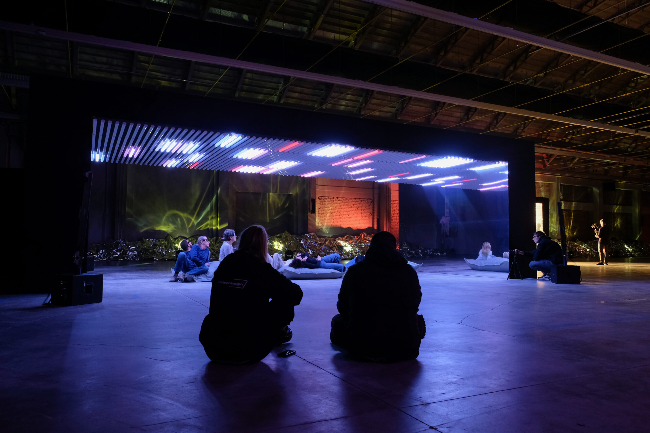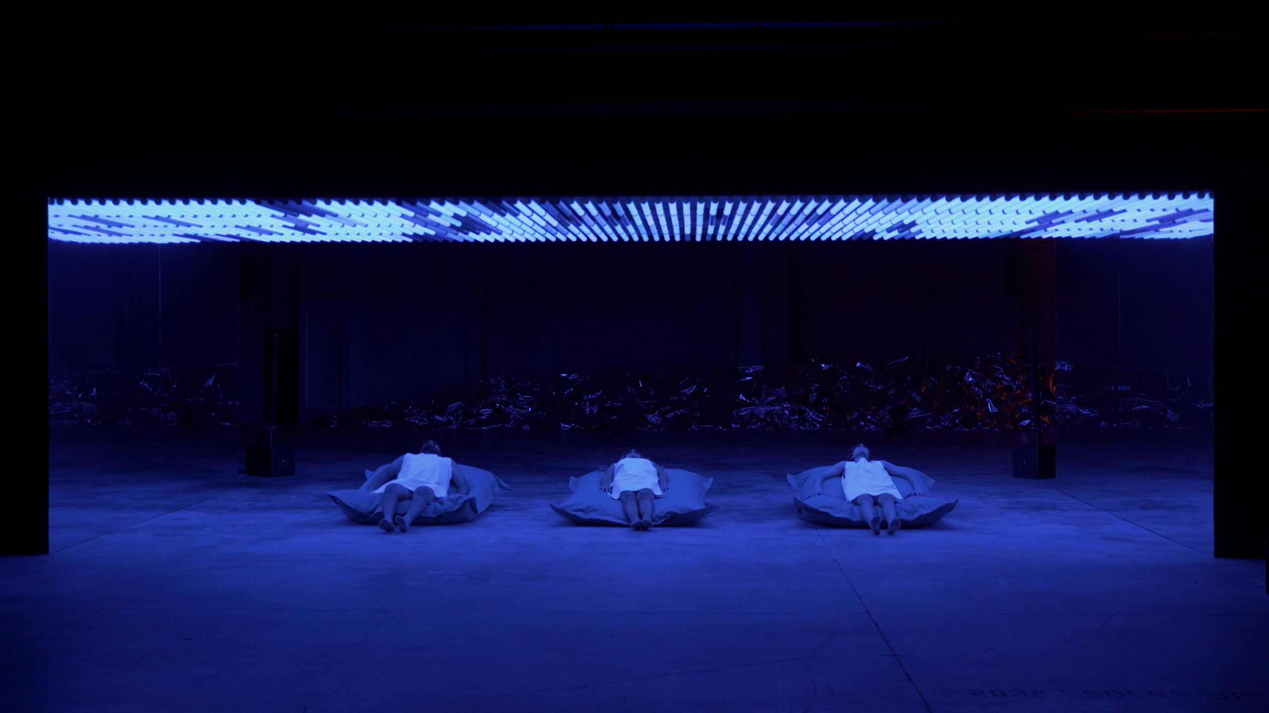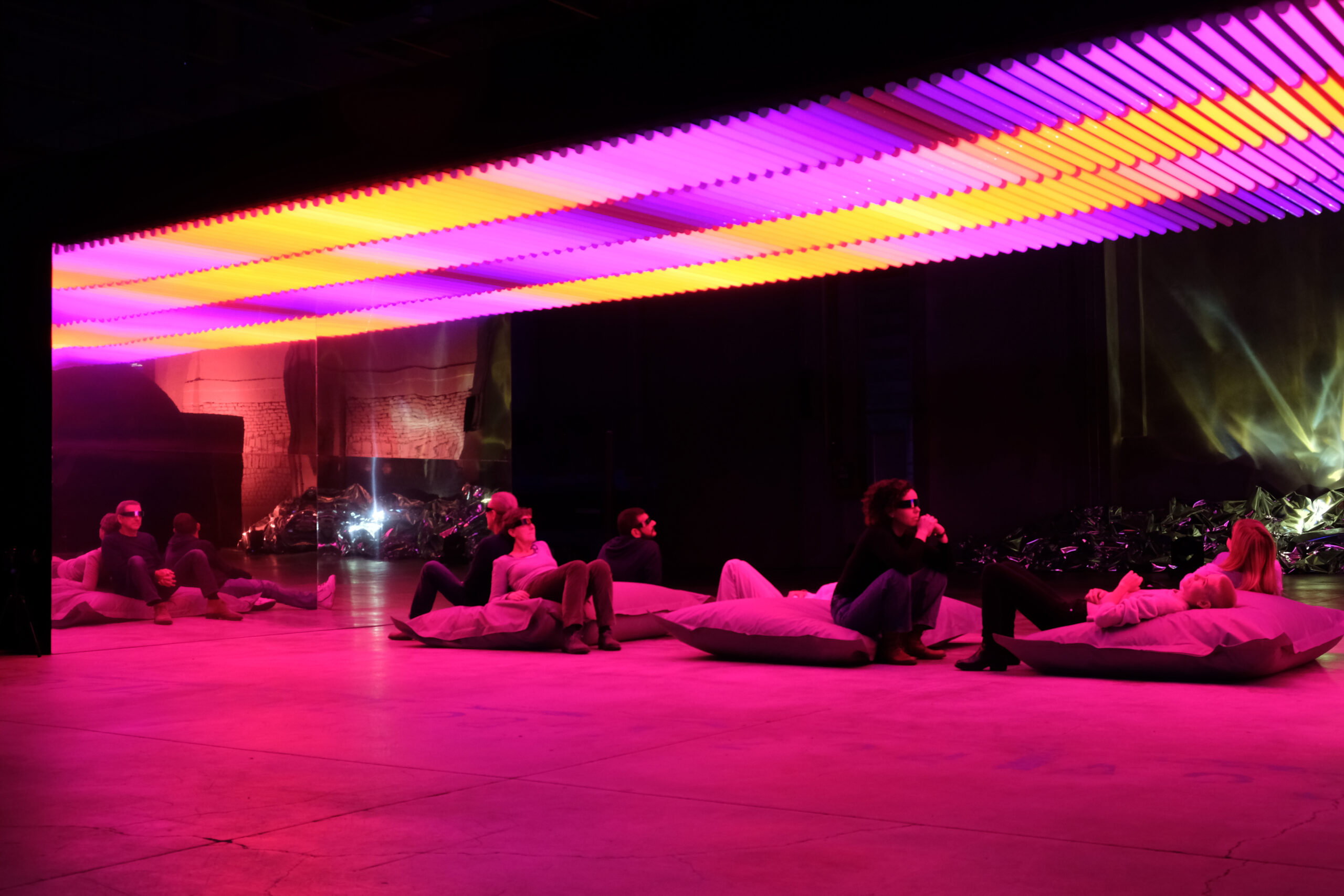 Structure 8x4m, 32sqm, 320 light tubes, cushions, mirrors, quadraphonic sound. Duration 10′