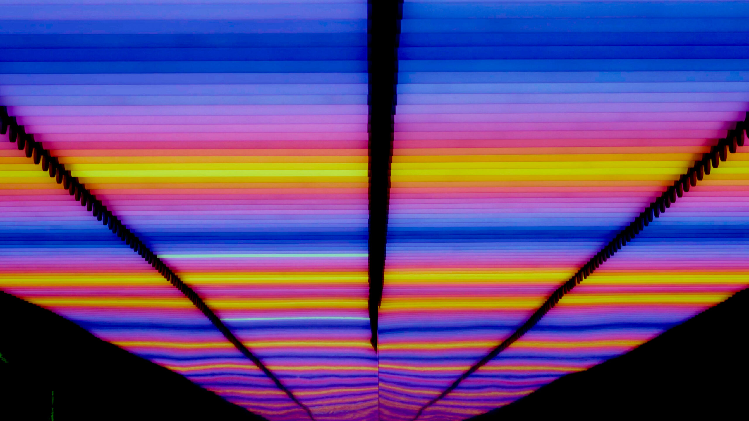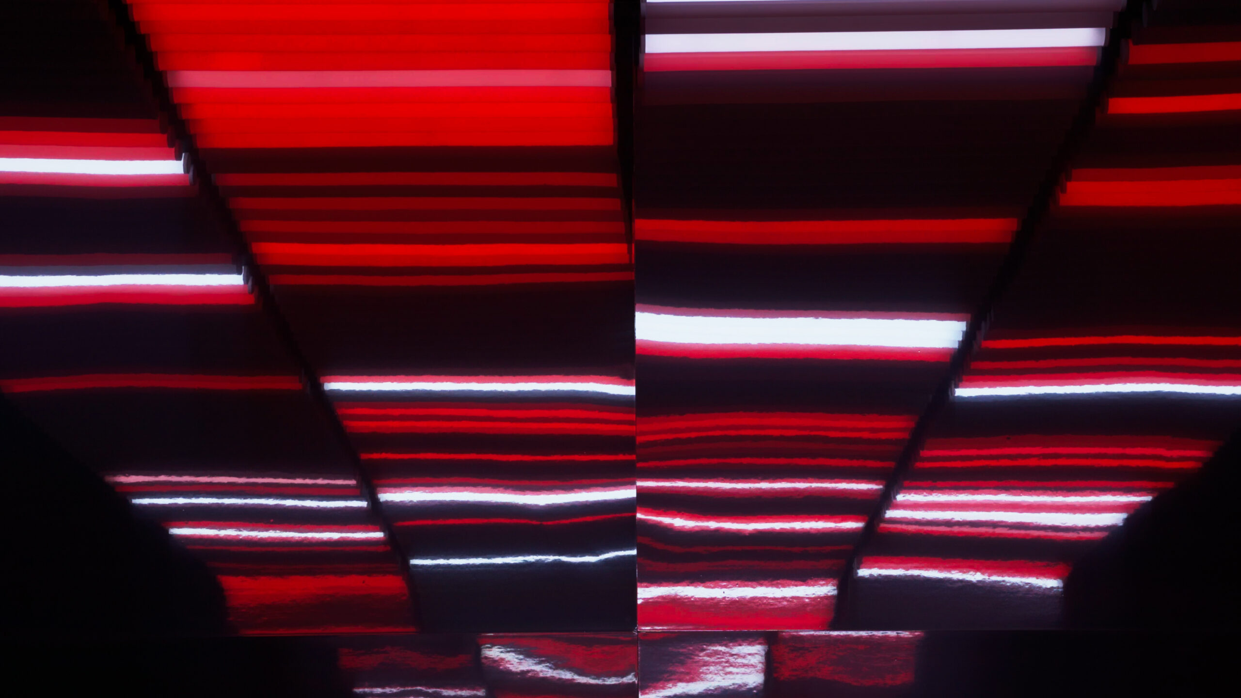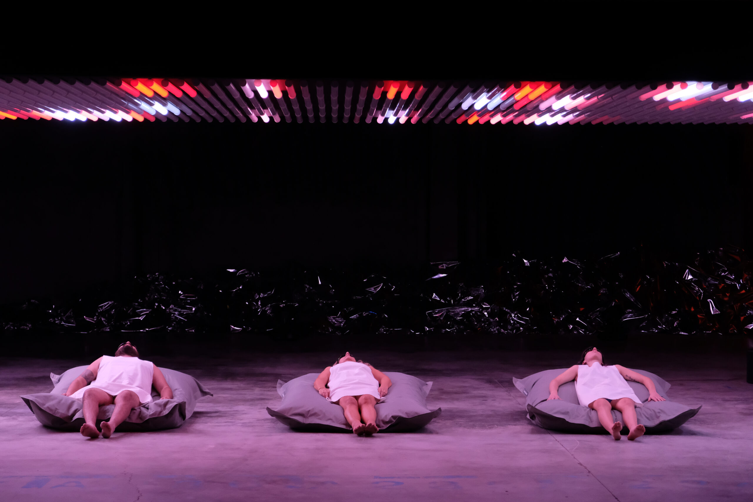 Structure 8x4m, 32sqm, 320 light tubes, cushions, mirrors, quadraphonic sound. Duration 10′